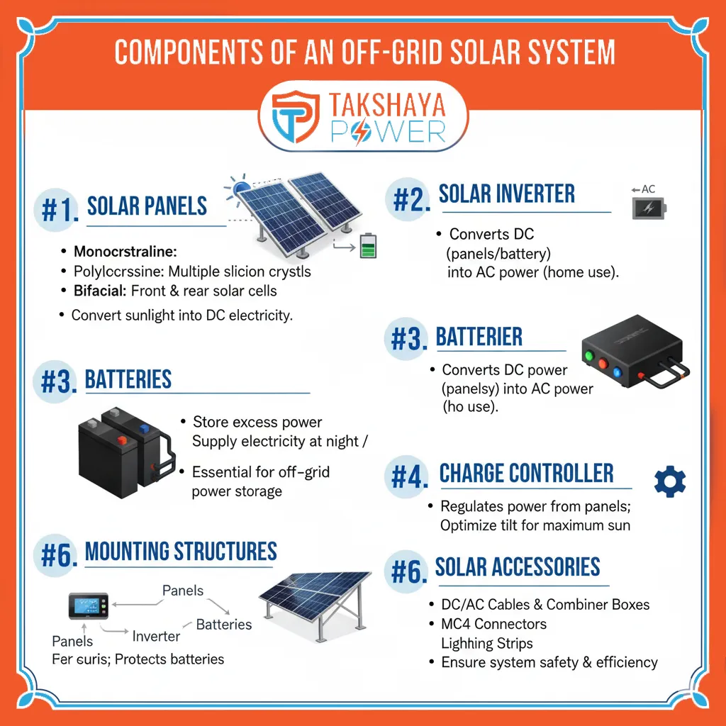 Beyond the major components, a range of essential solar accessories ensures the safe, efficient, and reliable operation of the entire off-grid system. These include: