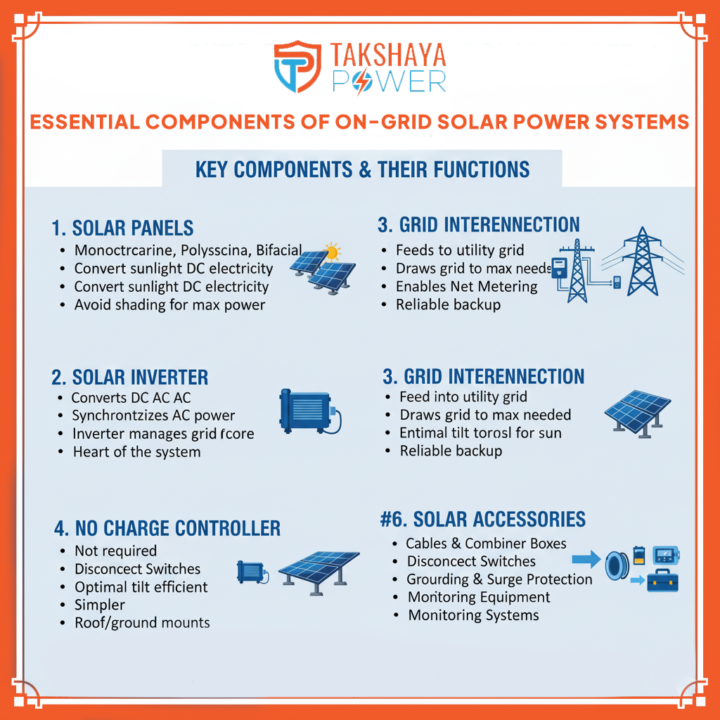Beyond the major components, a range of essential solar accessories ensures the safe, efficient, and reliable operation of the entire on-grid system. These include: